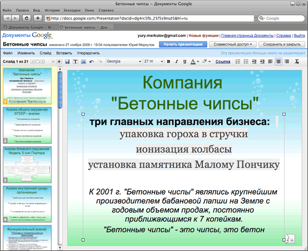 Особенностью презентаций Google является их просмотр непосредственно в окне браузера. Проект не обязательно загружать на жесткий диск. Вы можете осуществить публикацию документа, разослать приглашения по электронной почте. Отпадает необходимость в переносе презентации локальными средствами, например, на флэшке. Достаточно, чтобы компьютер, на котором будет демонстрироваться проект широкой публике, был подключен к интернету.