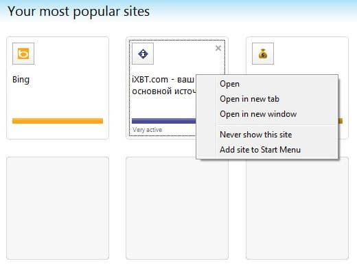 В новом IE реализована более интересная технология — здесь тоже есть большие окошки с названиями сайтов, но это не фиксированный список. В него попадают наиболее часто посещаемые сайты, а полоска внизу показывает, насколько часто пользователь туда ходит. Это намного удобнее, чем постоянно лазить и менять фиксированный список — система сама отберет ваши любимые сайты (а ведь на любимые сайты вы ходите чаще всего, не так ли?) и именно они будут в вашем личном топе.
