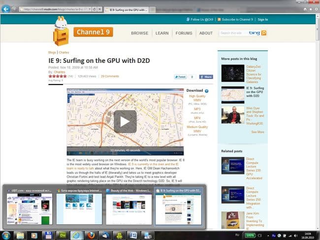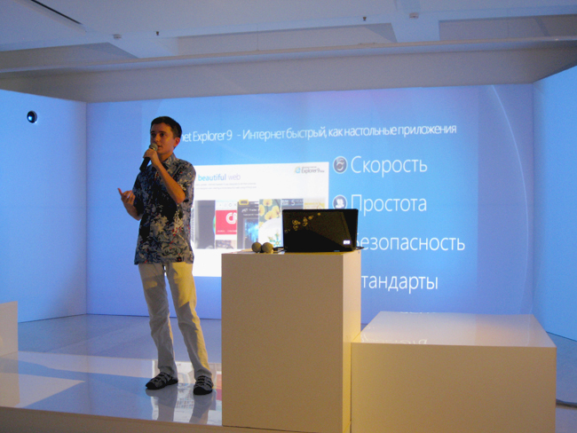 Всего лишь на сутки позже мирового старта и в Москве прошла презентация бета-версии нового браузера на русском языке. Поэтому часть информации в этом материале будет из англоязычной презентации, часть — из русскоязычной, а также сопутствующих технических материалов. Наконец, мы решили не полагаться только на материалы презентаций Microsoft и самостоятельно попробовали, как работает IE9.