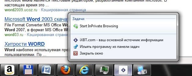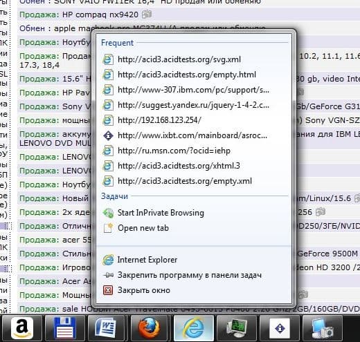 На панели закреплены сайты amazon.com (слева) и ixbt.com (справа). По центру — просто открытые окна IE9. Такое меню появляется, если щелкнуть правой кнопкой по иконке iXBT.com — сайта без оптимизации под IE9.