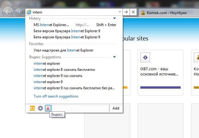 На мой взгляд, удобство особо не пострадало. И забота об этом возложена на выпадающее меню. Современные пользователи уже привыкли, что стоит начать печатать что-нибудь либо в адресной строке, либо в меню поиска, и компьютер услужливо выдаст список подсказок. Для обеспечения сохранности частной жизни в IE9 по умолчанию отключена интеграция поисковых систем в браузер, т. е. набранные буквы не передаются в них для формирования своего списка подсказок, эту функцию надо включить отдельно. По умолчанию система выдает подсказки только из набранного и локальных результатов.