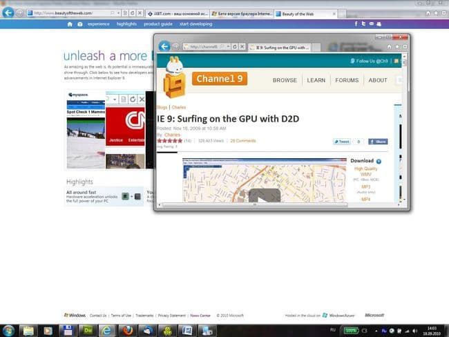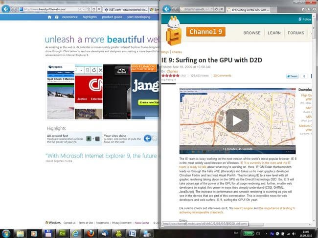 Посмотрим, что нового IE9 может предложить нам в функциональном плане. Список основных достоинств IE9 можно посмотреть на сайте Microsoft. Далее мы расскажем о них подробнее.