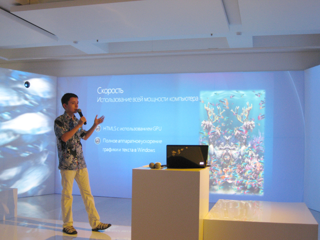 Тест на скорость воспроизведения IE Fish Tank иллюстрирует возможности аппаратного ускорения. Производительность его сильно зависит от мощности графического адаптера. У меня, например, на старом ноутбуке скорость была 12 кадров при 20 рыбках, тогда как на презентации компьютер тянул порядка 25 кадров при 200 рыбках.