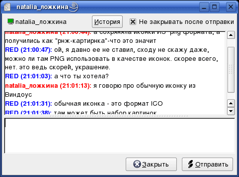 В отличие от стандартной ICQ, вы можете вести диалог с несколькими собеседниками в одном рабочем окне. Новые беседы добавляются в виде вкладок.
