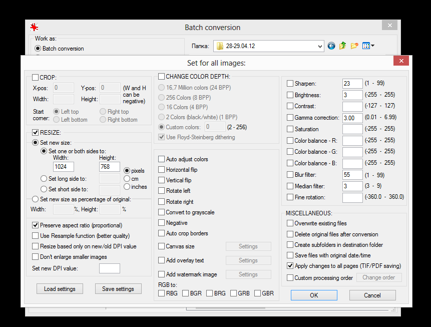 Больше всего здешнее пакетное преобразование напоминает IrfanView. Но, в отличие от последнего, FastStone Photo Resizer не так «враждебно» настроен по отношению к пользователю и предоставляет удобные расширенные параметры.