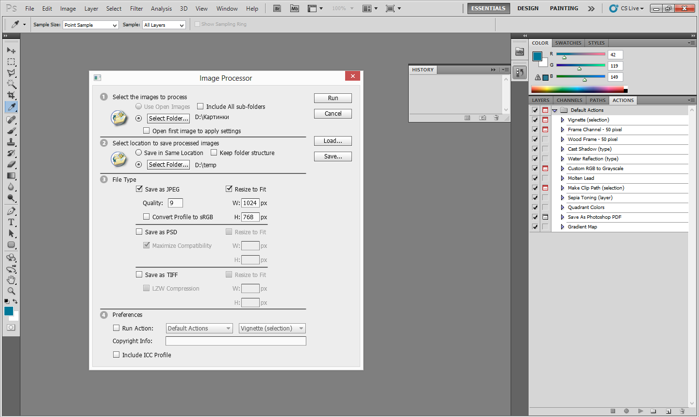 Чаще всего более приемлемым будет второй метод обработки с использованием скрипта Image Processor. Он удобен для выполнения таких простых действий, как смена формата или изменение размера изображения. Вызвать настройки можно через меню «File — Scripts — Image Processor…». Удобство подхода состоит в том, что не нужно записывать экшен. Все остальные настройки практически аналогичны вышеуказанному способу. Сохранение возможно только в JPEG/PSD/TIFF.