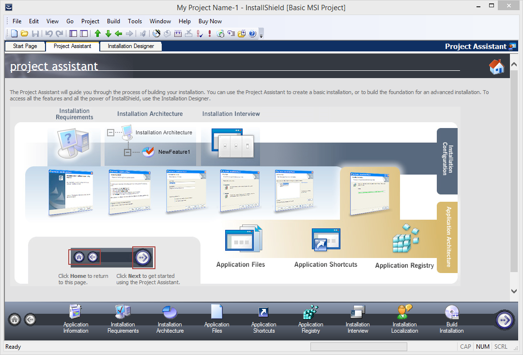 Есть несколько вариантов начала работы в InstallShield, один из них — воспользоваться пошаговым мастером настройки (Project Assistent), который запускается автоматически при создании нового проекта. Более детальная конфигурация осуществляется в окне дизайнера установки. Настройки сгруппированы следующим образом: