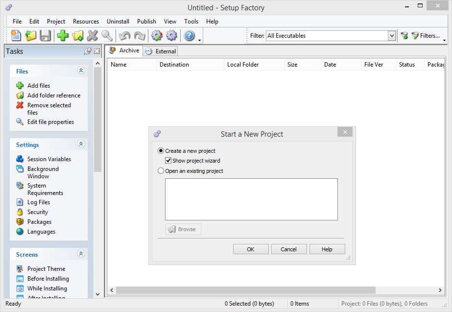 Создавая проект с нуля, можно воспользоваться мастером, однако он, по сути, мало что решает. Редактор проектов состоит из следующих разделов: Project Definition (Свойства проекта), Installation Details (Установки), Setup Appearance (Внешний вид), Setup Requirements (Зависимости) и Script Logic (Сценарий).