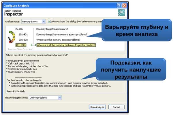 Те, кто уже знаком с инструментами многопоточного анализа Intel, наверняка обнаружат сходство с Thread Cheker. Действительно, в чем-то интерфейс был позаимствован оттуда, однако он значительно расширен, а механизм обнаружения ошибок и инструментирования, который лежит в основе Inspector’а, уже совершенно другой. Тем не менее, технология бинарного инструментирования несет с собой значительные накладные расходы на выполнение приложения. Поэтому оно будет исполняться дольше, чем его оригинал. Это неизбежная реальность. В связи с этим пользователю предоставлена возможность управления интрузивностью анализа. Для этого перед началом анализа он выбирает один из четырех уровней анализа, в зависимости от его глубины.
