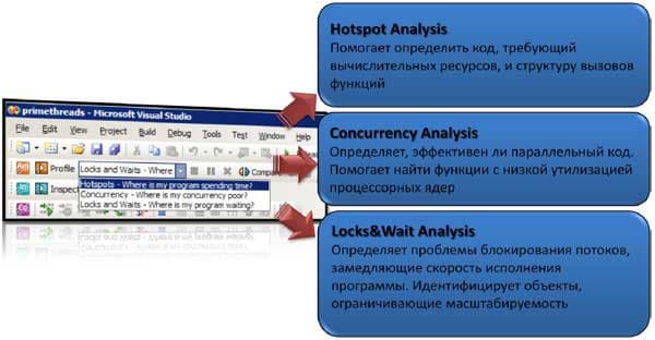 Так как цикл разработки может быть непрерывен и повторяем в смысле возврата к коррекции дизайна после любого этапа, вплоть до оптимизации производительности, важно, чтобы все эти инструменты слаженно работали в одной среде и могли взаимодействовать друг с другом. Именно поэтому они глубоко интегрированы в среду Microsoft Visual Studio, и вам уже не придется запускать отдельные профилировщики и создавать отдельные эксперименты, когда нужно найти потоковые ошибки или оптимизировать программу. Весь функционал доступен в текущем проекте, из тулбаров или меню Visual Studio, а результаты анализа размещаются там же, где и файлы проекта. Хотя пользователь может и сам выбрать, где ему хранить файлы с результатами.
