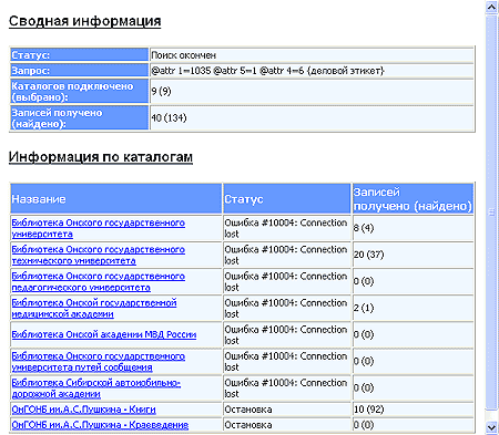 Результаты обработки запроса можно увидеть на панели состояния, где отображается прогресс поиска, количество выбранных библиографических ресурсов и тех, с которыми установлено соединение, количество найденных и полученных записей, количество записей в "корзине".