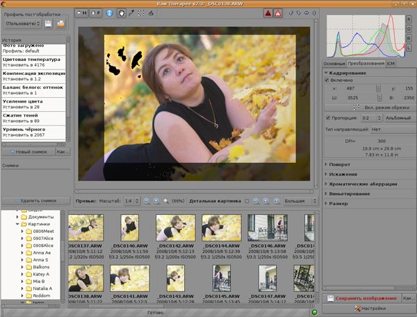 Программа, обладая массой интересных опций, на практике малоэффективна по причине отсутствия пакетного режима. Долгая и кропотливая возня с одной фотографией - тоже полезное дело, но для этого не обязательно устанавливать RAW-конвертер. В Linux есть прекрасный графический редактор - GIMP, творческие возможности которого значительно превосходят RAW Therapee.