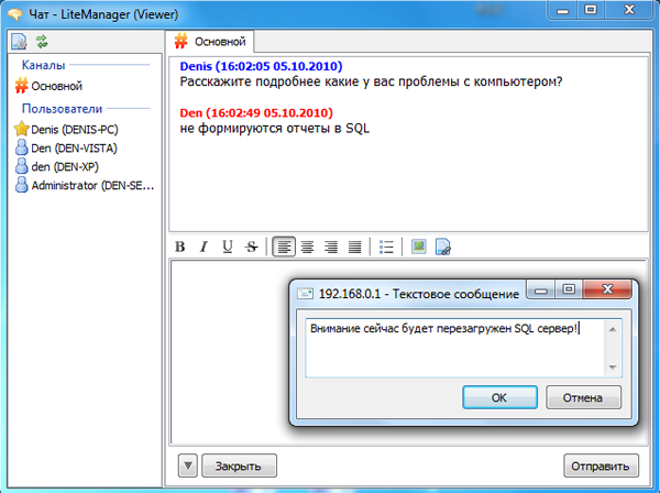 При помощи встроенного чата можно общаться с удаленным пользователям. Возможна также отправка простого сообщения которое появится на экране удаленного пользователя поверх всех окон, что привлечет его внимание.