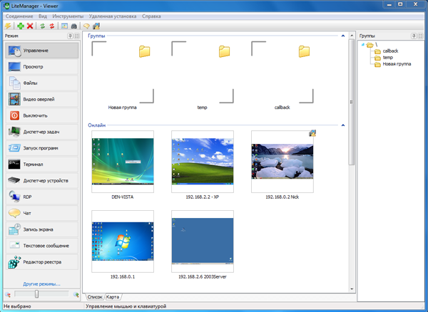 На вкладке Режимы расположены доступные режимы удаленного доступа, достаточно выбрать нужный режим работы и кликнуть по компьютеру в списке. На вкладке Группы выводится список групп соединений для более удобной навигации по списку компьютеров. Расположение вкладок можно изменять по своему усмотрению или при необходимости скрыть их.
