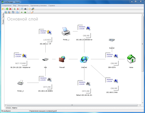 Список соединений может отображаться и в виде топологической карты, где компьютеры можно расположить в произвольном порядке, добавить дополнительный объекты такие как сканер, принтер, модем и т.д.