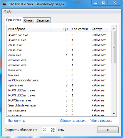 Встроенный диспетчер задач позволит управлять процессами и сервисами удаленного компьютера. Внешне он похож на стандартный диспетчер задач Windows.