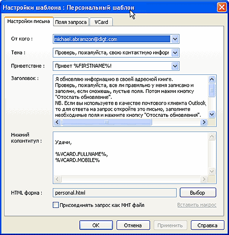 Если вы ведете деловую переписку, то кроме имени вашего респондента всегда полезно знать и другую информацию о нем - телефоны, название и адрес организации, факс, но не всегда эта информация указывается в получаемом письме. С помощью плагина можно сформировать и разослать по выбранным адресам специальную форму с определенным набором полей (этот набор вы формируете сами в процессе настройки). Респондент, заполнив форму, отправляет ее обратно (каким образом это сделать, говорится в самом письме). Полученные формы с помощью этого же плагина будут обработаны, и сведения из них добавлены в личные данные. (Этой возможностью уже довольно широко пользуются - в начале года неоднократно получал письма с такими формами от своих респондентов с просьбой проверить, поправить сведения и отослать их обратно.)