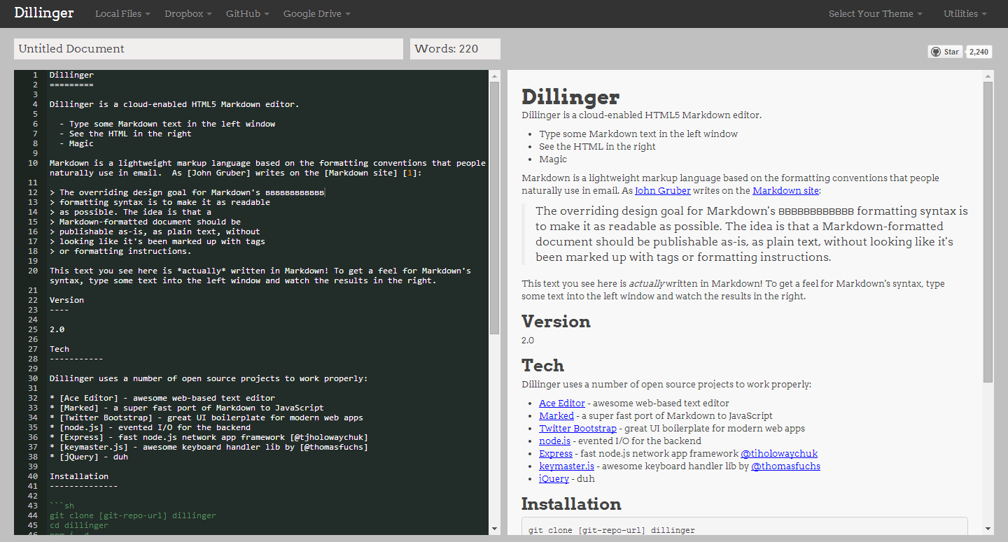 Dillinger — облачный HTML5-редактор с поддержкой markdown-редактирования. Основан на библиотеках Ace Editor, Marked, Twitter Bootstrap, node.js и других компонентах.