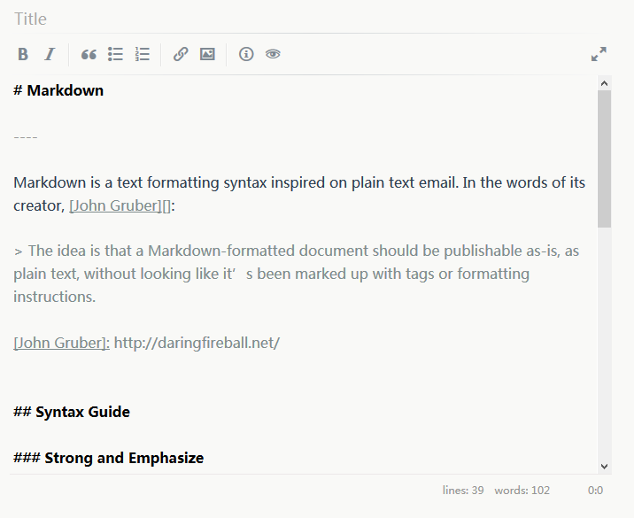 На верхней панели редактора присутствуют кнопки markdown-форматирования. В нижней части — статистика по словам, навигации. Предосмотр и переход в полноэкранный режим осуществляются одним нажатием. При этом не очень удобен изначальный режим редактирования: слишком узкая панель, которую можно было бы расширить или добавить к ней еще одну, с предосмотром.
