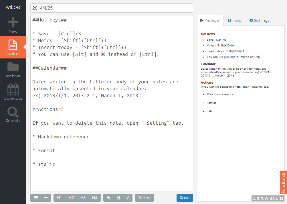 Все записи хранятся на сервере в упорядоченном формате в разделе «Архив», вследствие легко найти искомую заметку. Также есть поиск. Еще один интересный раздел — «Календарь». Даты, которые были вписаны в заголовок или тело заметки, автоматически добавляются в расписание. Календарь wri.pe можно подключить ко внешним сервисам вроде Google Calendar или iCal.