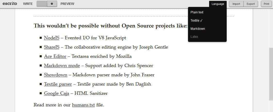 Escrito — редактор для совместной работы с документами. Поддерживаемые форматы для импорта — Textile, Markdown. На экспорт доступны TXT и HTML.