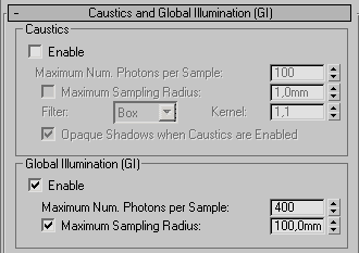 Поскольку фотонные карты для каустик-эффектов и глобального освещения обрабатываются по отдельности, их настроечные параметры также разделены. Настройки карт для расчета диффузных переотражений света собраны в группе Global Illumination.