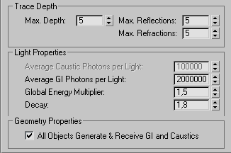 Группа Trace Depth (или глубина трассировки фотонов) управляет максимальным количеством и типом столкновений, которые могут испытать фотоны GI и Caustic типа с поверхностями вдоль траектории распространения, и, в конечном итоге, длину траектории фотона. Max Reflections – максимальное число отражений фотона всех типов (т. е. диффузных и зеркальных), Max. Refractions – максимальное число преломлений фотонов прозрачными поверхностями, также в контексте типа фотонной карты – диффузных преломлений для GI и преломлений на идеальные углы для Caustic PM. Max. Depth – суммарное число рассеяний фотона, как отражений так и преломлений. Максимальное число рассеяний фотона не может превышать этой величины, поэтому, если сумма значений Max. Reflections и Max. Refractions больше Max. Depth, тип рассеяния для каждого фотона будет довольно случаен, если в сцене присутствуют как отражающие, так и прозрачные поверхности.