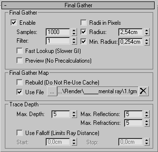 Наконец, и это особенно актуально для больших сцен, полезно ограничивать длину рассчитываемых FG-лучей при помощи Use Fallofff и использовать детализацию FG-расчета с расстоянием при помощи указания FG-радиуса в пикселах.