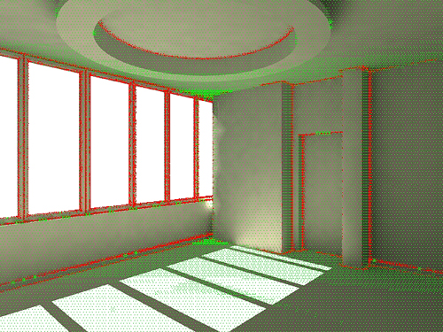 Интересно то, что информация о сэмплирующих FG-лучах, используемых для расчета интегралов освещения методом Монте-Карло, может быть успешно использована и для расчета обоих типов градиентов освещения. В самом деле, каждый сэмплирующий луч характеризуется координатами пересечения с другой поверхностью, величиной освещения в точке пересечения и углом относительно нормали в точке поверхности, откуда он был испущен. Учитывая, что для FG - расчета одной точки используется до нескольких тысяч лучей, понятно что этой информации вполне достаточно, чтобы оценить изменение освещения в сцене для каждой FG - точки. Я не буду описывать сам механизм таких расчетов, поскольку он довольно специализирован и не связан непосредственно с обсуждаемой темой, а тем, кто интересуется данным вопросом, рекомендую обратиться к вышеуказанным статьям.