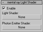 При определении источника важнейшим является оператор light shader, от которого и зависит, как свет испускается источником. Как правило, light shader определяет цвет, затухание, свойства теней и другие параметры, в зависимости от программируемых функций шейдера. Базовая библиотека mental ray base.dll содержит три основных light shader: mib_light_point для omni-источника, mib_light_spot для spot light и mib_light_infinite для directional light. Четвертый шейдер mib_light_photometric предназначен для использования световых профилей в фотометрических источниках. По умолчанию, эти шейдера скрыты, и чтобы получить возможность работы с ними в 3ds max, необходимо отредактировать декларации шейдеров в base.mi.