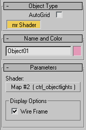 - Перетягиваем шейдер ctrl_objectlights в редактор материалов и в поле transform вводим: Имя_объекта |Instance(Mesh00). Почему именно так? Дело в способе автоматической генерации имен для instance, который использует 3ds max - приставка "|Instance(Mesh00)" всегда добавляется к имени объекта и результат присваивается как имя для instance объекта. Например, если объект имеет в 3ds max имя "Pyramid01", то в transform нужно ввести: Pyramid01|Instance(Mesh00), поскольку именно таким будет имя instance для Pyramid01 и это легко проверить, экспортировав сцену в mi-файл.