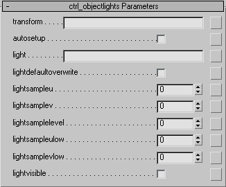 В поле light нужно ввести Имя_источника_света|Light, поскольку, опять же 3ds max так генерирует имя источника света при его определении в конструкции light … end light. Например, если имя источника в max Pyr_light, то в поле light шейдера ctrl_objectlights следует вводить Pyr_light|Light.