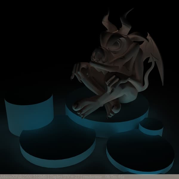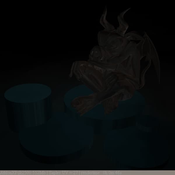 Можно осветлить тень, поиграв с ее прозрачностью при помощи параметра Shadow Trancparency шейдера Light Point: 0 - полная непрозрачность, 1 - полная прозрачность тени, то есть - ее отсутствие. Значения между 0 и 1 будут давать различные степени прозрачности. Однако вместо этого будем использовать final gathering.