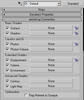 Примечание. Поскольку 3ds max использует собственную схему указания источников света для объектов, параметры light и mode скрыты. Если работа ведется только с light шейдерами 3ds max, эти параметры не понадобятся. Если же потребуется работать с исходными light-шейдерами mental ray, скорее всего, их придется открыть.