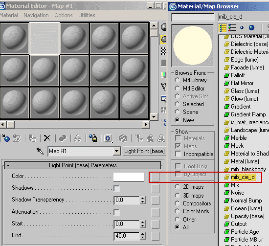 Таким образом, если работать со стандартными материалами 3ds max, о привязке освещении можно не беспокоиться - она может быть выполнена стандартными средствами max. Но если в материале используются стандартные шейдера mental ray, может возникнуть ситуация, когда придется редактировать списки источников в материалах.