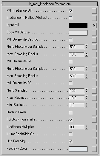 параметры Num. Photons per Sample, Max. Sampling Radius для каустики и GI, Num. Samples, Max. Radius, Min. Radius, Radii in Pixels для FG являются параметрами качества расчетов и идентичны аналогичным из секции Indirect Illumination глобальных настроек, но действуют только для материала, подключенного в слоте Input Mtl.