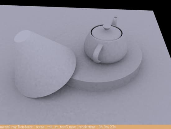 Расчет вторичного освещения с индивидуальными настройками FG для материала чайника и цилиндрической подставки (увеличено число сэмплов) и материала конуса и земли (увеличены только радиусы)