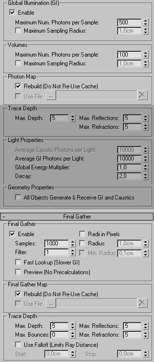 позволяет управлять яркостью освещения рассчитанного final gathering отдельно по каждому каналу.