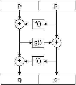 Преобразование P() замещает 8-битное входное значение p = pl || pr (pl и pr имеют размер по 4 бита) 8-битным значением q = ql || qr путем следующих вычислений (см. рис. 4):