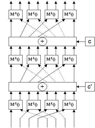 Сначала в данной операции выполняется обратная (по отношению к применяемой в операции E()) байтовая перестановка, затем применяется операция M-1(), затем выполняется XOR обрабатываемых данных с константой c’ и т.д.