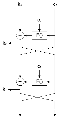 Процедура расширения ключа весьма проста и напоминает таковую у отечественного стандарта шифрования ГОСТ 28147-89 [17] – исходный ключ шифрования делится на фрагменты K0...Kn-1 (n – размер ключа шифрования в 16-битных словах), т.е.:
