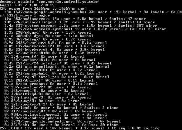 Теперь оценим нагрузку процессора, с помощью той же самой удобной утилиты dumpsys.