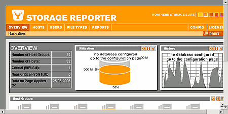 Отчеты. Конечно, какая система может работать без них? В системе Northern Storage Suite есть специальный модуль, работающий на одном сервере с Master Server и отвечающий за формирование всевозможных отчетов. Это - Storage Reporter. Используя информацию, сохраняемую в базе данных, он формирует множество самых разнообразных и необходимых для анализа отчетов. Отчеты формируются для трех уровней: макроуровень, на котором формируются сводные отчеты по всем контролируемым серверам, средний уровень - здесь формируются отчеты по серверам, дискам, типам файлов и группам пользователей и микроуровень, на котором можно получить отчеты по отдельным пользователям, разделам, папкам почтовой системы, отдельным типам файлов.