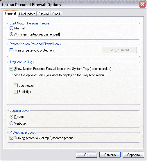 На вкладке General (общие) можно просмотреть и изменить тип запуска программы (вручную или автоматически, при запуске системы). При необходимости можно включить защиту настроек программы паролем (Turn on password protection). Значок программы можно убрать из трея, сняв отметку с пункта Show Norton Personal Firewall, отметив пункты Log viewer и Statistics, можно включить в контекстном меню, вызываемом щелчком правой кнопки мыши на значке в трее, показ пунктов меню, выбор которых откроет окно для просмотра событий и для просмотра статистики, соответственно. Переключатель Logging Level предназначен для изменения количества информации, которая будет заноситься в журнал событий (стандартная или расширенная). Отметка пункта Turn on protection for my Symantec product включает защиту модулей программы от изменения.