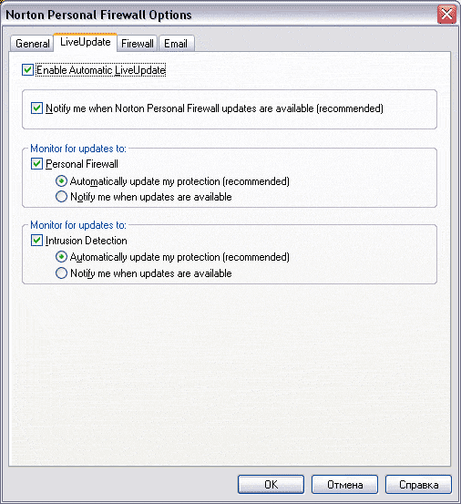 На вкладке LiveUpdate (обновление) можно настроить параметры обновления программы. Автоматическое обновление можно отключить (для этого нужно снять отметку с пункта Enable Automatic LiveUpdate). Автоматическое обновление может быть включено только для проверки обновлений файрвола (Personal Firewall) и/или для проверки обновлений модуля обнаружения вторжений (Intrusion Detection). Обновления могут быть скачаны автоматически или перед их загрузкой программа может запросить у пользователя разрешение на то, чтобы их скачать и установить (Notify me when updates are available).