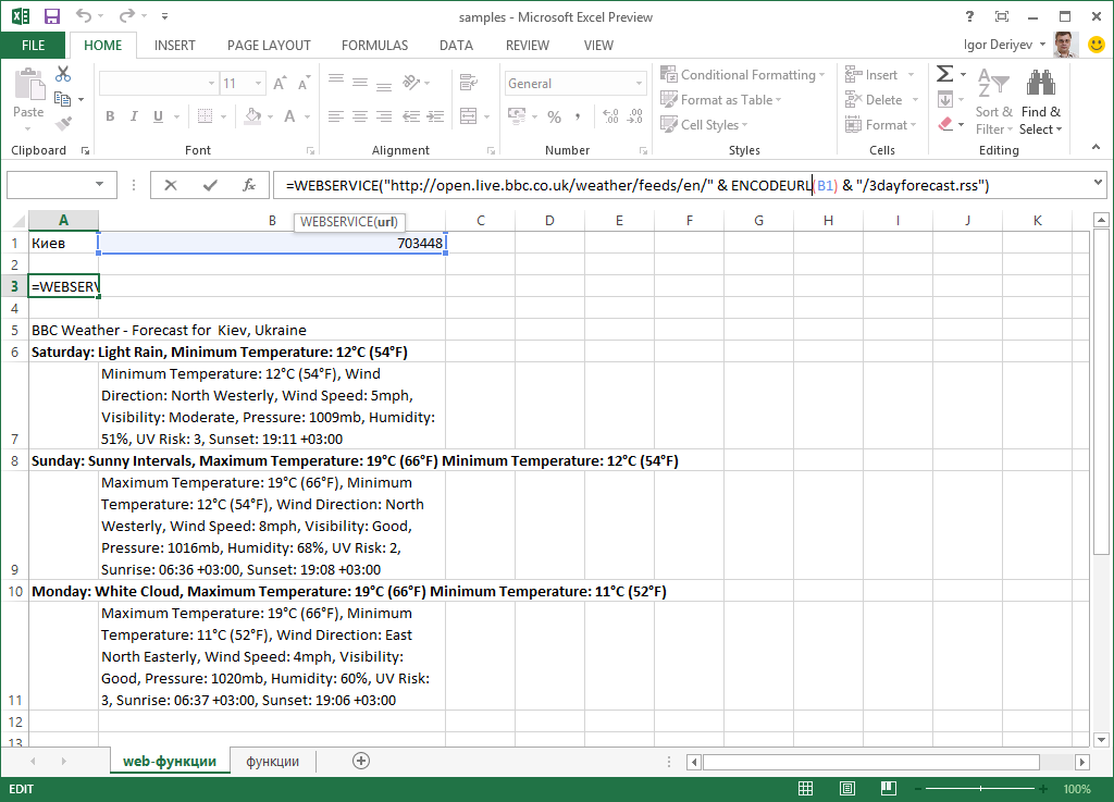 В ячейке A3 находится конструкция =WEBSERVICE("http://open.live.bbc.co.uk/weather/feeds/en/" & ENCODEURL(B1) & "/3dayforecast.rss"), которая получает «сырые» XML-данные с трехдневным прогнозом. ENCODEURL здесь использована исключительно для демонстрации, так как на самом деле код города можно использовать и без подобного преобразования.