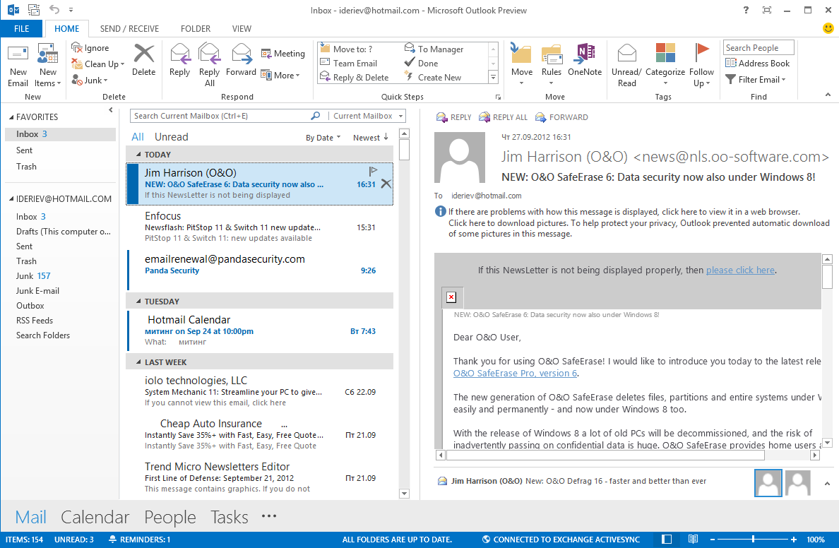 Программа Outlook в целом сохранила прежнее оформление, хотя интерфейс все-таки изменился в духе общего направления, т. е. был упрощен и «уплощен». Тем не менее, опытный пользователь заметит и кое-какие функциональные новшества. Так, список писем стал более функциональным, каждый его пункт теперь содержит первую строку из тела письма, также прямо здесь сообщение можно пометить как прочтенное/непрочтенное (полоска слева) или удалить — в последнем случае также действует вся полоска вдоль правого края, хотя соответствующий значок появляется только посередине, что поначалу может вызывать путаницу.