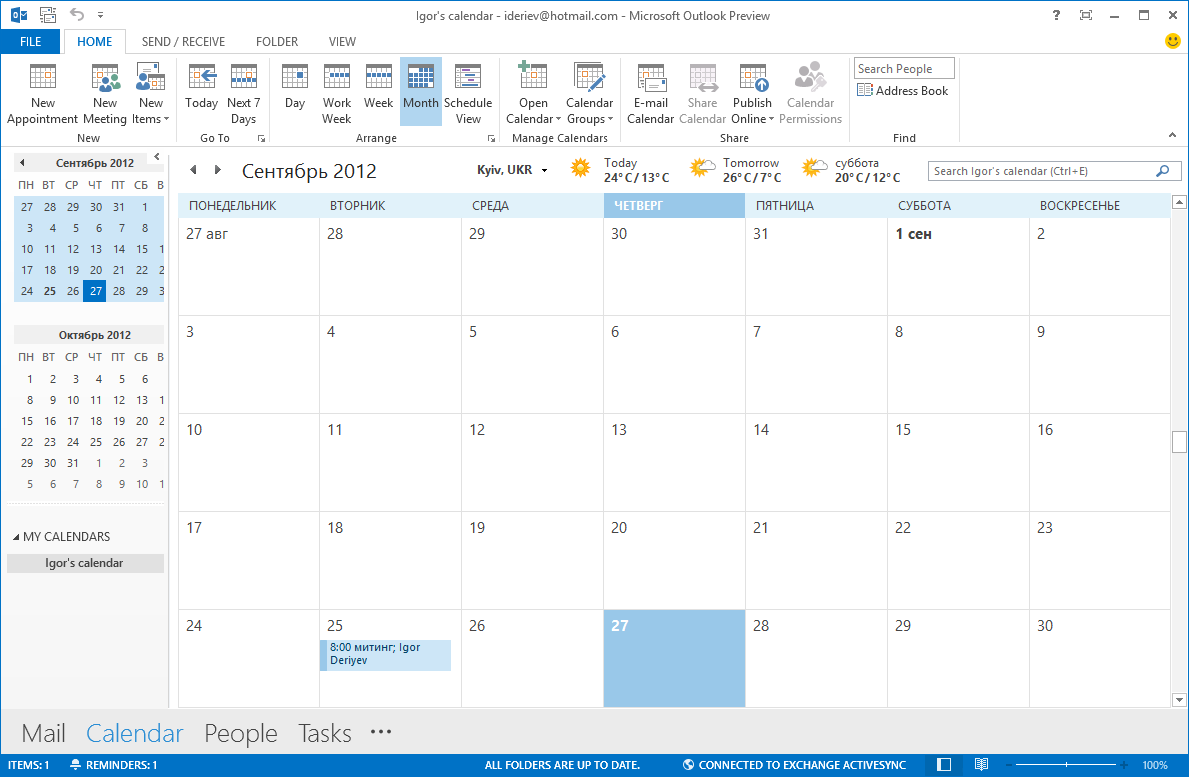 Во-первых, Outlook 2013 будет доступен во всех редакциях Office 2013, что многим позволит одинаково применять эту программу как на работе, так и дома. Во-вторых, Outlook 2013 стал поддерживать Exchange ActiveSync (EAS), а не только полноценные серверы Exchange. Это значит, что пользователи смогут работать с почтой в push-режиме и легко синхронизировать списки контактов и календари, так как EAS для популярных онлайновых служб стал стандартом де-факто. Впрочем, подключиться таким образом пока можно только к Hotmail, а с Gmail возникают ошибки — вероятно, Google необходимо модернизировать поддержку протокола. В целом это еще один харакетрный признак движения в сторону мобильного стиля работы.