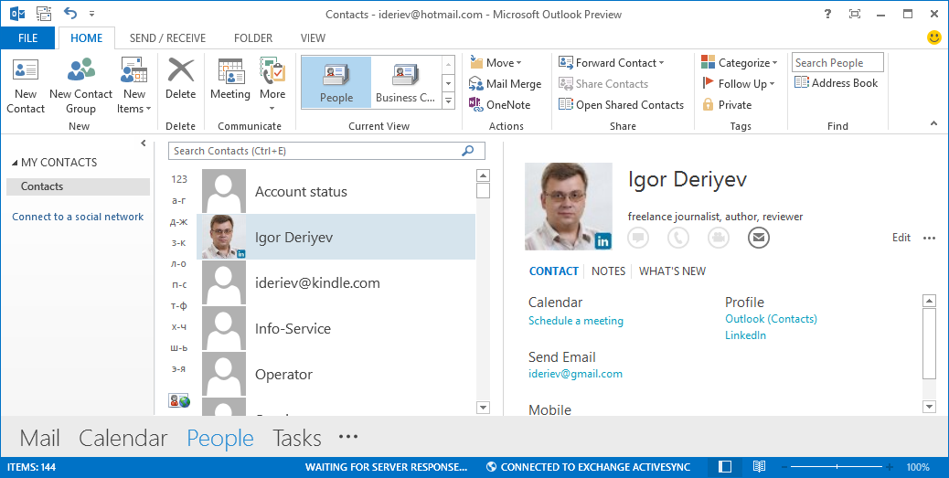 В духе Windows Phone раздел Контакты теперь заменен на People (Люди), хотя старорежимное название кое-где еще встречается. Карточка для каждого реципиента содержит все его реквизиты, инструменты для всех доступных видов коммуникаций (к которым в перспективе должен добавиться Skype), информацию из социальных сетей, из которых Facebook и Linkedin поддерживаются изначально (на уровне всего Office 2013).