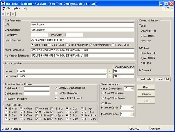 О функциональности приложения можно косвенно судить по размеру дистрибутива. Объемные программы чаще всего имеют больше возможностей, чем их крохотные сестры. В любой закономерности бывают исключения. В нашем случае - это Site-Thief. Семь мегабайт кода потрачены, по большому счету, на то, чтобы только показать одно окно со скромным набором опций. Нельзя сказать, что Site-Thief – самая примитивная программа. При желании, можно отыскать немало offline-браузеров, по сравнению с которыми Site-Thief будет выглядеть сверхсложным приложением. Но и размер найденных программ будет соответственный – от силы несколько сотен килобайт. Не семь мегабайт – это точно.